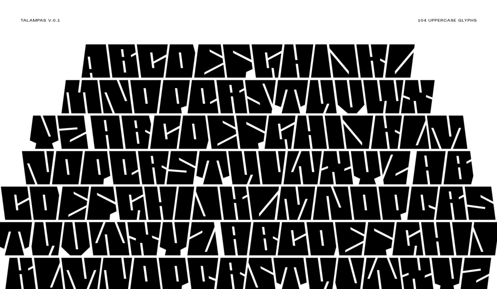 Talampas is an experimental typeface whose stature emerged from landforms, particularly the flat highlands called talampas or plateau characterized by a steep slope rising sharply above the surrounding area.